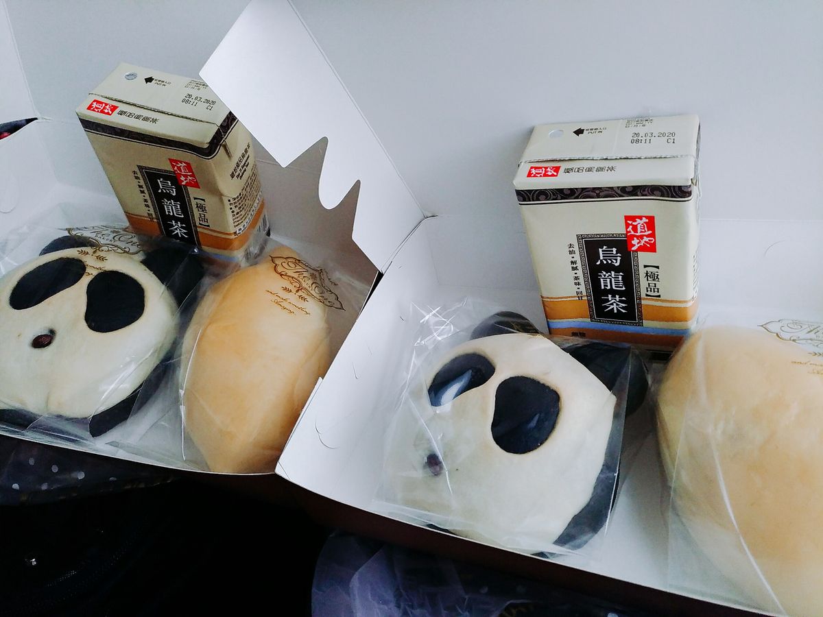 バス車内でパンダパン、カレーパン、烏龍茶を渡され、車内で汚さないように食べて大丈夫とのことであった。味は普通。
