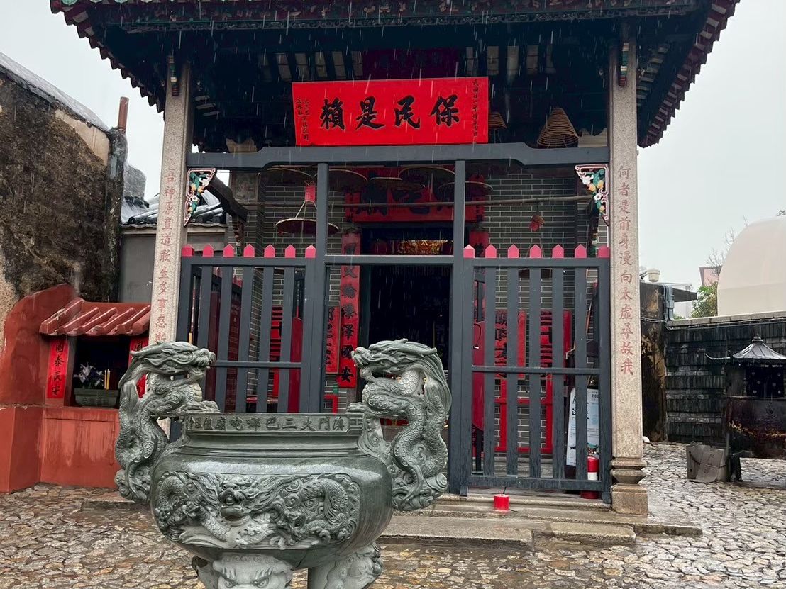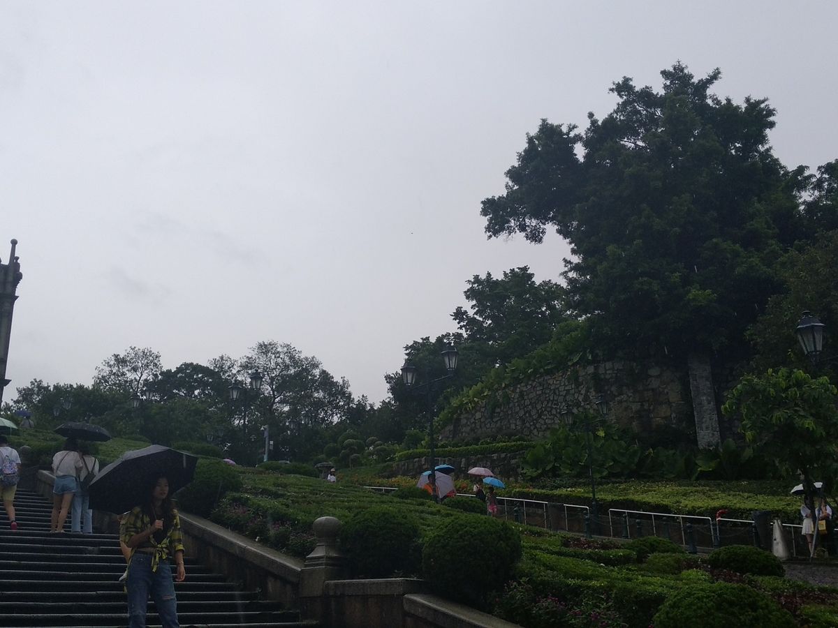 数年に1度の大型台風が接近とのこと(午後から、百貨店やカジノも閉鎖になりました)それでも添乗員さんは、「ギリギリまで案内します」と、歴史の話や世界遺産についての説明などをしてくださり、雨の中回れる範囲を案内していただけましたが、香港からの日帰り参加者をフェリー乗り場へ送り届けるためツアーは2時間経過したところで中止に。