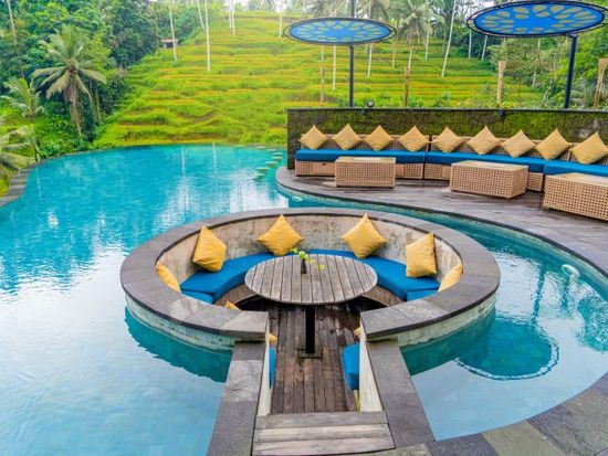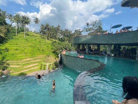 絶景カフェ&リゾート「クレティアウブド」。インフィニティプールから広がる緑豊かなライステラスの眺めは、まさに至福のひととき。ドリンクを片手に、美しい景色をゆったりと堪能ください。
