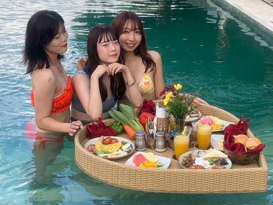 ❖フローティングブレックファースト:水に浮かぶトレイでいただく食事は、SNS映えも抜群の非日常体験