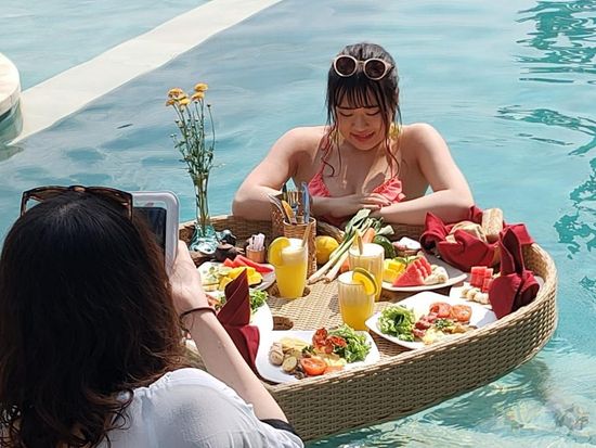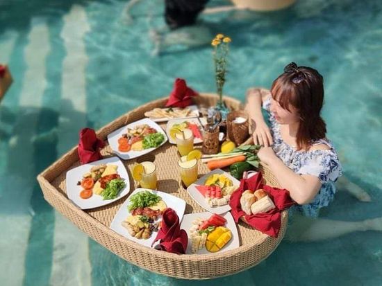 プールに浮かぶな特別なトレーに乗せて提供される、おしゃれな食事を満喫しましょう。SNS映えも抜群で、旅の思い出をフォトジェニックに彩ります。