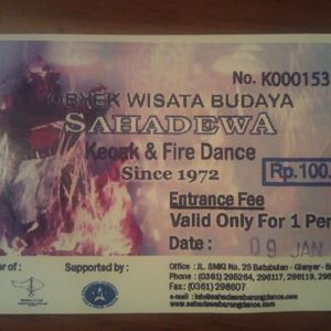 オプションですが、このツアーで最も良かったのがこの舞踊鑑賞でした。バロンダンス、ケチャックダンスとあともう一つのダンス(名称は失念しました)の3つから選択できるのですが、一番人気のケチャックダンスを鑑賞しました。写真はチケットです。表示の通り100,000ルピアでした。