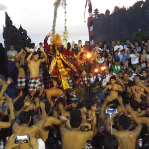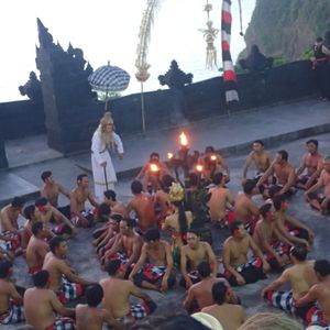 現地の人が多くお参りにきていました。インドネシアの正装はとても素敵ですね。サンセットは残念ながら曇りで半分見られませんでしたがウルワツ寺院は写真で見ていたより美しく、寺院の絶壁から見るインド洋の絶景を見ることができて十分です。ウルワツ寺院を見てから、隣接するケチャクダンスの会場に向かうののですが、満席にびっくり!そんな中でもガイドさんのおかげでとてもいい席で見ることができました。ケチャックダンスは、本当にケチャケチャと言うんですね。ガイドさんから配布いただいた案内に日本語でストーリーが書いてあったので、内容が分かって楽しめました。笑いもありドキドキもあり、バリ島の伝統舞踊を見ることができて大満足です。浜辺でいただくBBQディナーは、味付けがとてもよく美味しく全部いただきました。あの甘辛いソースは持って帰りたかったほどです。深夜便だったため、午後から参加して22時にまでに終わるツアーとしては最終日にピッタリでした。初めてバリ島に行く人にぜひおすすめしたいです!