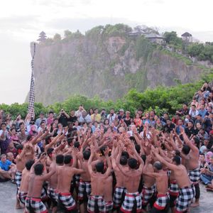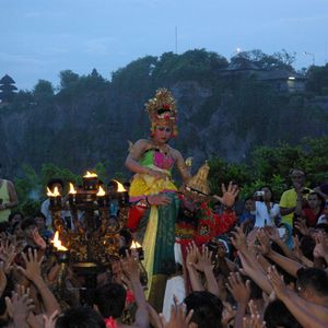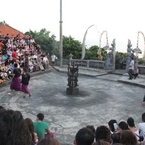 ウルワツ寺院は、寺院のロケーションは崖上で凄いものの、寺院自体は既に廃墟と化していて、ま~こんなものかというところでした。あいにくの天候で、夕日も見られず、仕方ないから期待もしていないケチャックダンスでも見ていくか、という感じになったのですが、ケチャックダンスは本当に見てよかったです。多人数の男性の「チャチャチャ」というかけ声も迫力がありましたが、それをバックにいかにも東南アジアという衣装に身を包んだ役者が素晴らしい演技をしていました。特に白猿を演じた役者は、観客席に乗り込んでいたずらを働き、大受けです。また、太っちょの魔物もユーモアたっぷり。伝統と、新しいエンターテインメントが融合されていて、なかなかのものです。また、正面のいい席でみると、壮大な崖と寺院が演技の背景となって雰囲気たっぷりです。