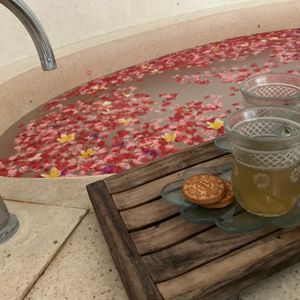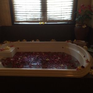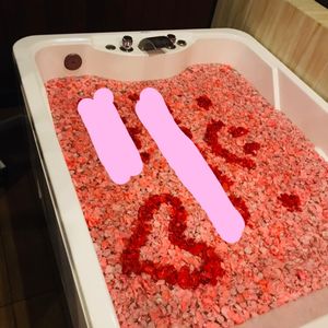 最初に暖かいお湯で足を洗っていただく。120分のボディーマッサージ後は2種の湯船を選択でき、泡風呂+花びらを選択。その際に紅茶とロールケーキをいただく。
