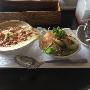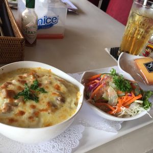 食事はホテルのカフェ?でグラタンを頂きました。写真では少ないように見えましたが、なかなかのボリュームで味も美味しかったです。