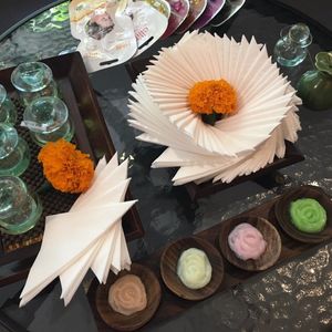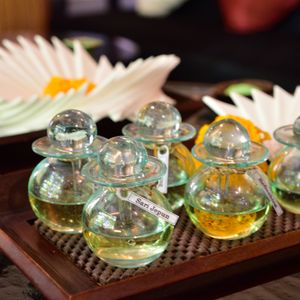 ハチミツのあとマッサージ師さんが部屋の外に出てくれるのでその間にゆったりとバスタイムでした。シャンプー、ボディソープ、ボディタワシ、バスタオル、浴衣みたいな着替えが用意されていました。頭はこのあとシロダラするので洗わなくていいと言われたので体だけ洗いました。お花をたくさん浮かべた湯船があり、ドリンクとクッキーをいただきながら入浴しました。ドリンクは受付の時にスイカか、メロンジュースを選べました。
