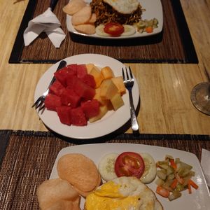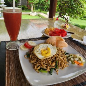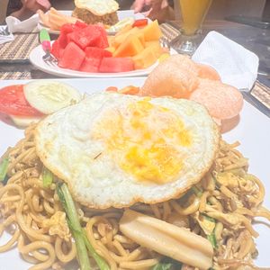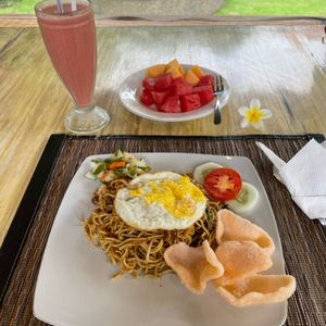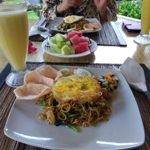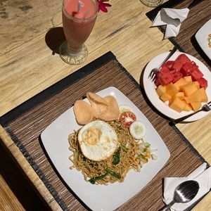 友人とナシゴレンとミーゴレン1つずつ注文し、ソフトドリンクと何とフルーツまで!