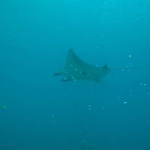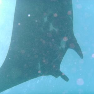 アドレナリン全開でビデオを撮りまくり、正面から頭上スレスレを通り過ぎていく大きな個体を下からあおり撮影すると、真っ黒なお腹に白い斑点・・・ブラック・マンタでした。