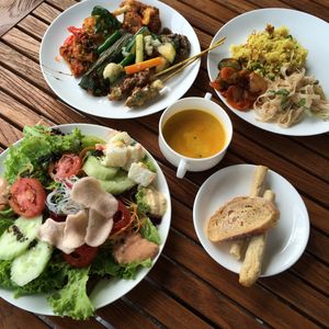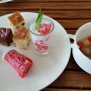 かぼちゃスープ、野菜、ポテトサラダ、フルーツ、デザートのバリのお菓子5種類ほどから食べ放題です。