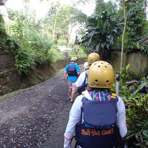 朝のピックアップですが、ホテル到着時間は予定通りでした。そこからウブドにある事務所で手続きをし、お手洗いやロッカー、更衣室をお借りします。準備が整うと、ライフジャケットなどを装備してしばらく待機後、出発地点にむかいますが、水辺まではかなり長い階段を下っていきますし、帰りはそのぶん?登る必要がありますので、けっこうたいへんです。ただ、お子さんやご老人も登っていますので、それが理由でやめてしまうのはもったいないです。