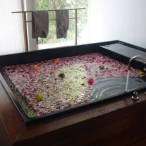 仕上げは、ヴィラ内にあるジャグジーでのフラワーバス。フラワーバスというのでお花が浮いているものを想像していたのでスが、果物や野菜などが入っていて、お花だけよりもこちらのほうが肌に良さそうなので、かえって良かったかも!