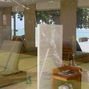 スパのエントランス、また施術のお部屋からもインド洋の白い波が臨めます。全体的に白を基調にしたデザインで、とても気持ちがいいです。