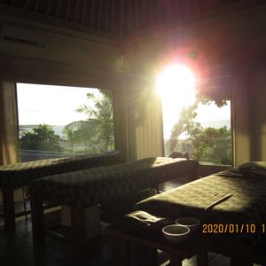 夕日を見ながらのスパとの謳い文句でしたが、うつぶせで施術されていたたため、見れず。。。室内の癒し音楽にいい気分なところ、途中から近くのレストラン?から騒音が。。。気になって気になって