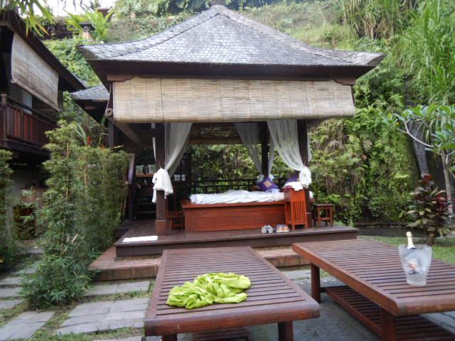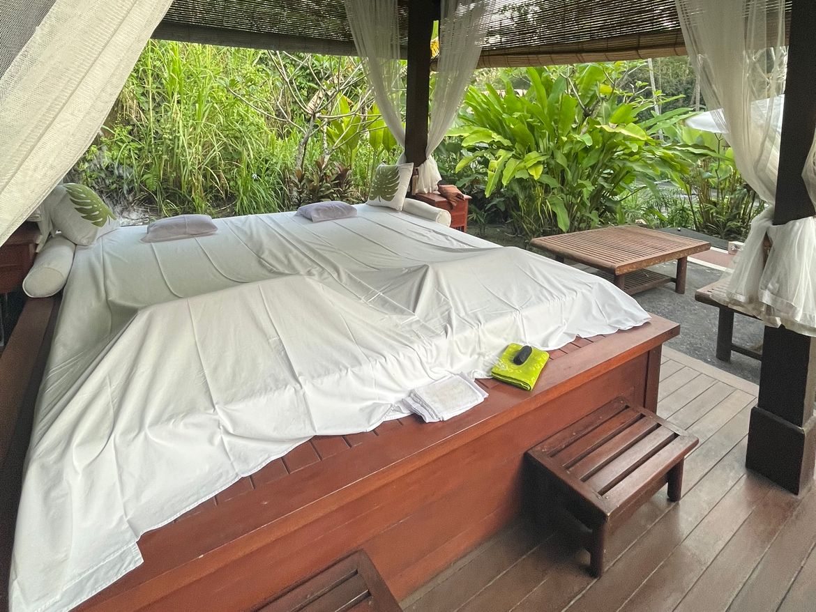 施術場所は、森の中の川辺にベッドの置かれた四阿、露天のバスタブと野趣溢れる環境でした。