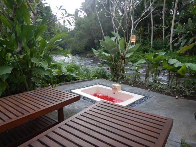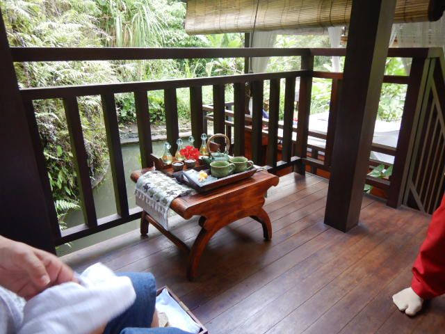 階段を降りていくと、本当に自然に囲まれた場所でした。エントランスからスパまでの範囲とスパの場所に感激でした。リバーサイドのスパ、大きなパラソルの下で風が心地よい中でマッサージを受けました。