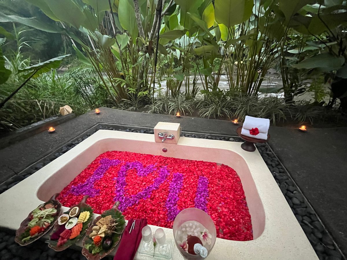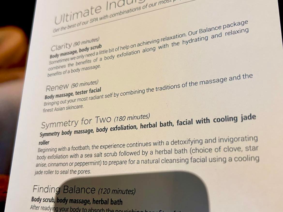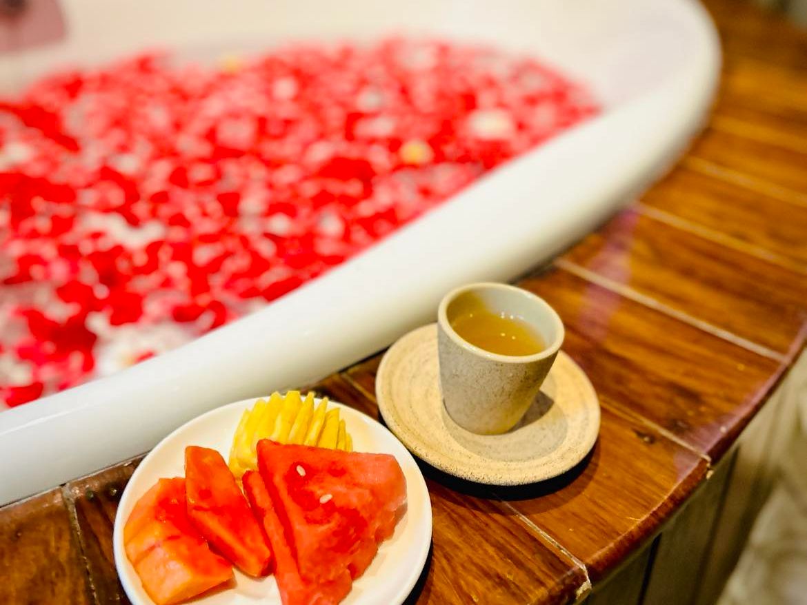 コースにはフットマッサージ、全身オイルマッサージ、ボディスクラブ、フェイシャル、デコルテケア、ヘッドマッサージ、そしてフラワーバスが含まれていて、最初から最後まで完璧でした。