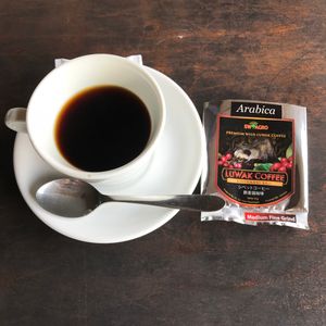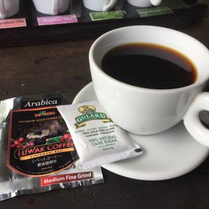 【コピルアク】のコーヒーが飲みたいけれどいい所がないかとリクエストして農場に連れて行ってもらいました。コーヒーはオスは80,000Rp、メスは50,000Rpで試飲できます。東京で飲むと数千円なので試すにはお手頃。他にもたくさんの種類のお茶とコーヒーも試飲できます。