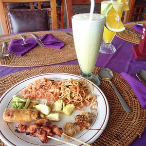 ・ディナーでインドネシア料理の中でも麺が食べたいと伝えたところ、少し考えて田んぼの間にある池の上に作られた伝統的な竹製のバンガロー風の個室のあるレストランを案内していただきました。そんなに遠くもなく、夕日も見れて本当にすばらしいチョイスでした。