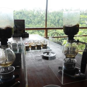 食後はバリコーヒーの農園に見学に行きました。ジャコウネコというヤマネコの一種が一度食べて排出した豆を焙煎するという、変わった製造方法のコーヒーで、世界的にも希少価値が高いコーヒーのようです。コーヒー農園からの熱帯雨林の景色を見ながら、優雅なコーヒータイムを堪能しました。ここでは、他にも20種類くらいのコーヒーやフレーバーティの試飲ができ、お土産にも買って帰れますのでおススメです。