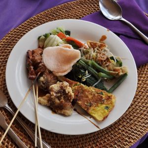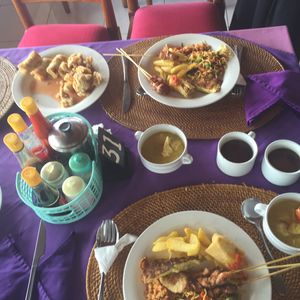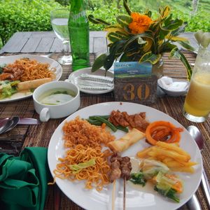 1,500m以上の標高に位置するキンタマーニ高原の真向かいに位置するレストランでランチ休憩。一通り絶景を写真で押さえた後、いざブッフェランチへ。お料理は典型的なブッフェ料理(インドネシアン)ですが、その中でもサテはその場で焼いたものを食べられ、絶品でした。他の料理も観光客にあわせてマイルドな味付けとなっております。