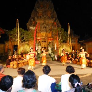 夕食後、バリ舞踊を見るために少し早めに王宮へ。ラッキーな事にちょうど有名なサダ・ブダヤ舞踊団が王宮でレゴンをやる日でした。人気らしく会場はとても混んでいて、椅子席は後ろしか空いていなかったのですが、舞台正面のカーペットに直接座る正面最前列で観ることができました。薄いカーペット一枚で長時間座っていられるか心配でしたが、ダンスが始まるとその美しさに足の痛さも忘れて見入ってしまいました。