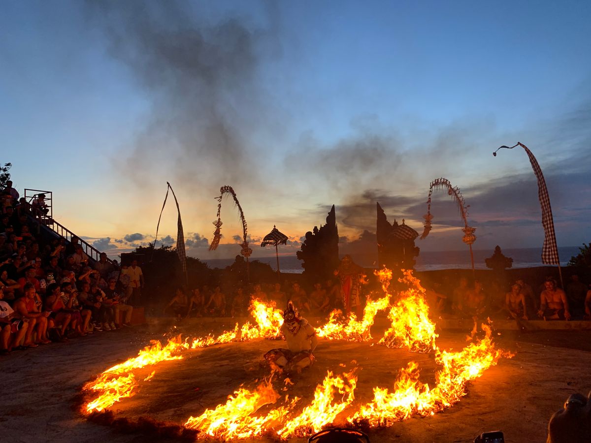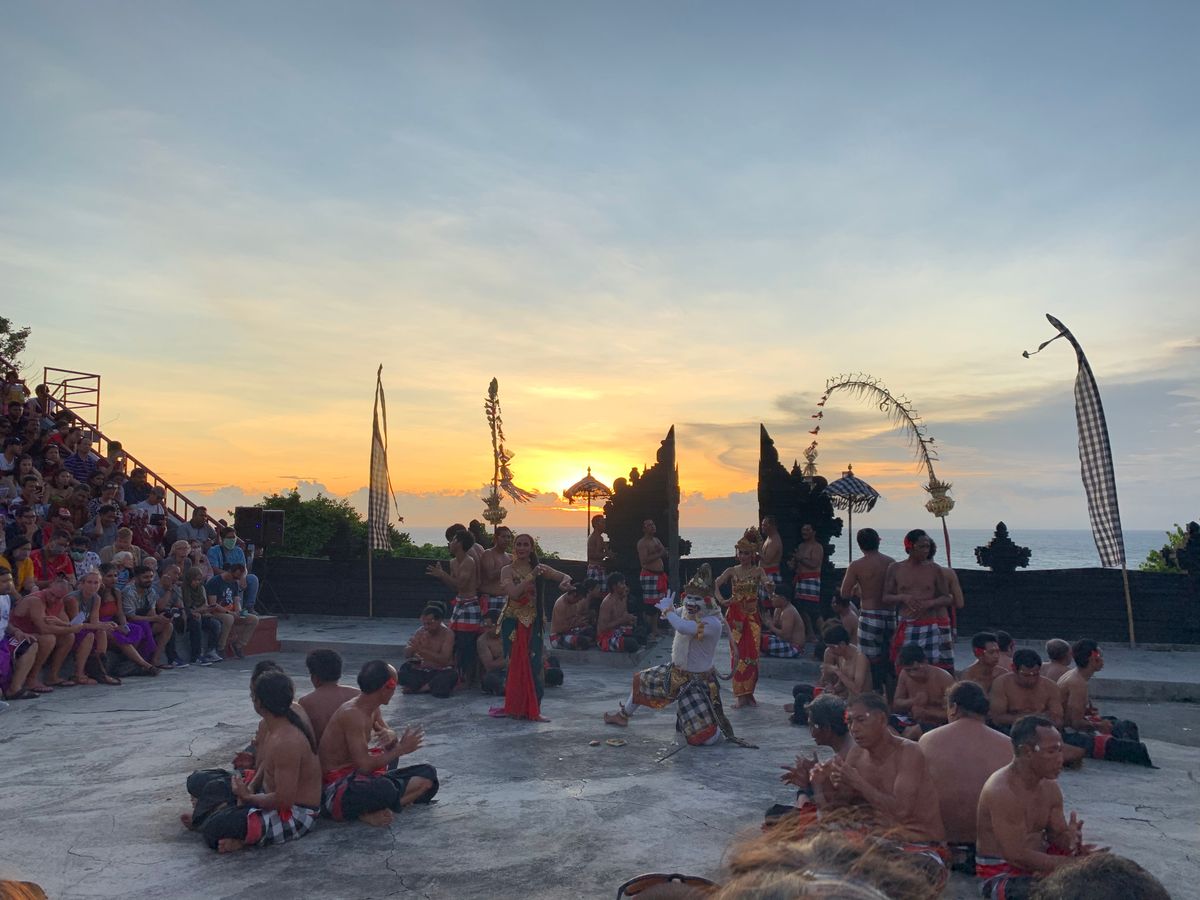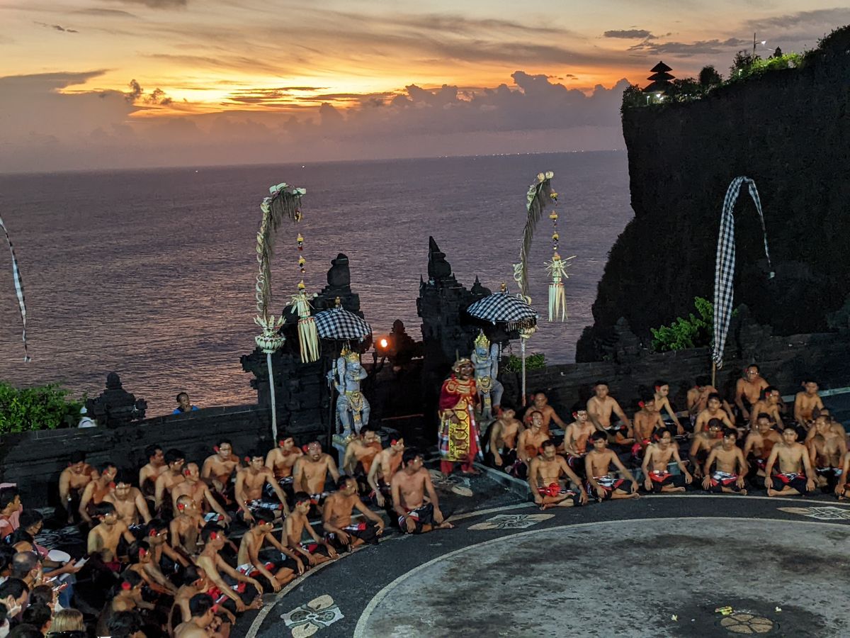 ウルワツ寺院に到着し、夕日を背景にケチャックダンスを観賞しました。観客席は想像と違ってほぼ満席でしたが、多くがインドネシア国内からの観光客の様でした。雨季のためか雲がやや多めながら、雨に降られることなく日が沈むところが辛うじて見ることができました。ダンスの方は、楽器を一切使わず迫力ある肉声の掛け声に乗って何人かのダンサーが踊り回り、すっかり見とれてしまいました。終演後のダンサーとの記念撮影もいい思い出になりました。ガイドさんも気の利く方で良かったです。このオプショナルツアーに参加して本当に良かったと思いました。
