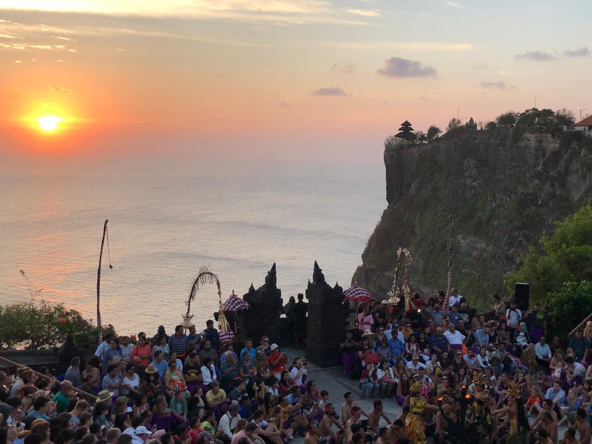 絶景!ウルワツ寺院の左右に断崖があり、インド洋の大きな波が押し寄せる様子は圧巻です。サンセットもご覧の通り、ケチャダンスの途中に沈む演出で盛り上げてくれます。ケチャはバリ島ではバロンダンス・レゴンダンスと並ぶバリ三大舞踊。一切楽器を使わず声のみで演じられ、迫力のある「チャ、チャ、チャ、チャ」というリズムに圧倒されます!最高の体験を是非!