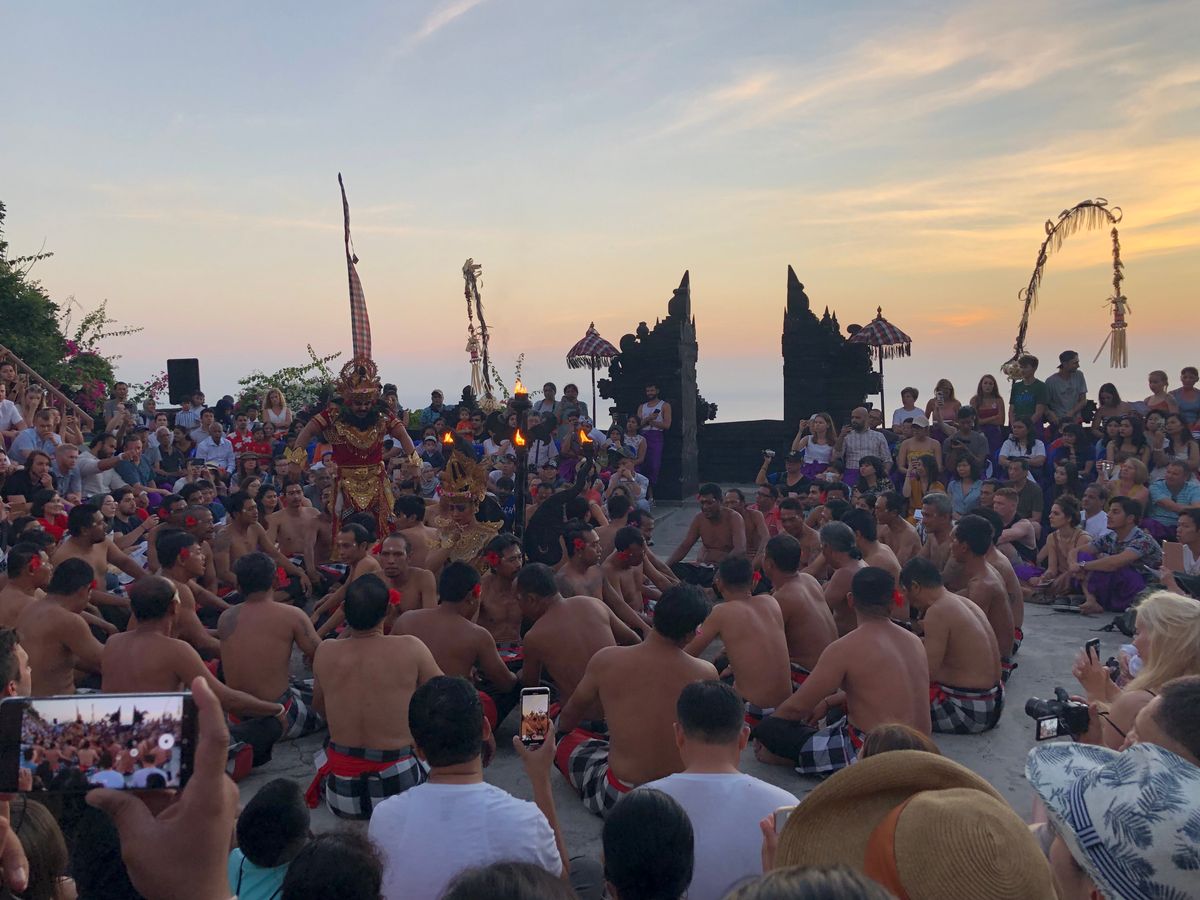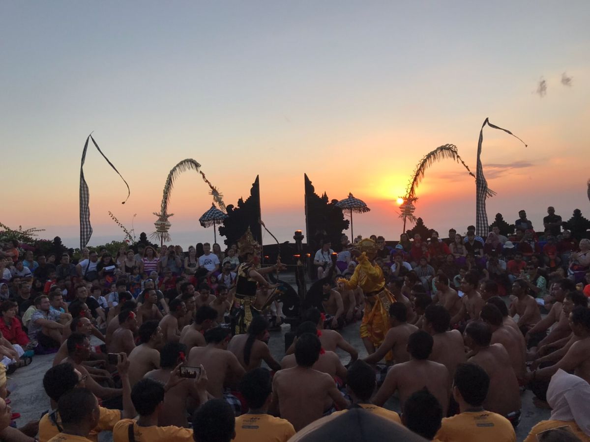 ケチャダンスは17:00開場。席は予約制では無くチケットも当日券なので、ドキドキしましたがとてもスムーズに中に入れ、割れ門の正面・夕日とウルワツ寺院もしっかり見える場所に席を取れました! 比較的コンパクトな会場なのですが毎日800〜1000人の観光客・地元民が集まるそうです。