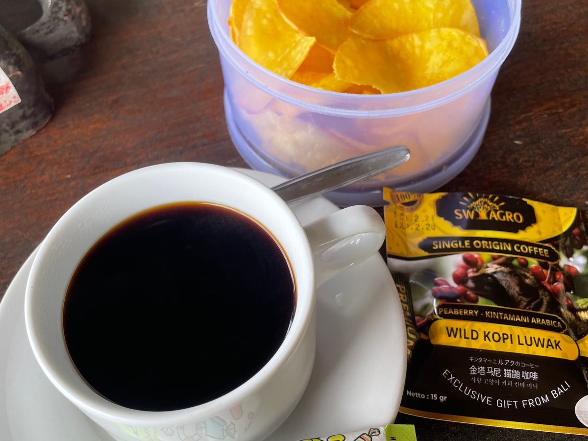 序盤に、キンタマーニ高原からウブド高原の間にコーヒー休憩を入れることを提案してくださり、ぜひとお願いしたところ、Santi coffee plantation というところに寄ってくださいました。有名な Kopi Luwak を作っているところで、実際にジャコウネコも飼われており、他のコーヒーの試飲とともに Kopi Luwak を飲むことができました。2人で行ったこともあり、オス・メスの両方の味の比較ができたのも貴重な体験でした。(確か1杯400円ほどだったかと思います)