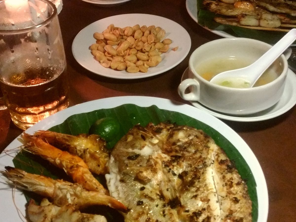 夕食のBBQも楽しめませんでした。会場は大混雑で、席について30分以上待たされた挙句に、空心菜炒め、ポテトフライ、白ご飯、冷えたシーフードグリル、スイカが10分ごとに出てきました。ウエイターも忙しそうで、給仕しているというよりも、餌を配っているといった感じでした。最初にメニューの説明もなかったので、空心菜炒めとポテトフライだけが揃った時点で、帰ろうかと思いました。