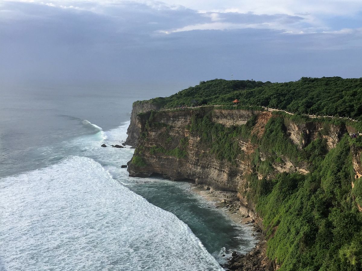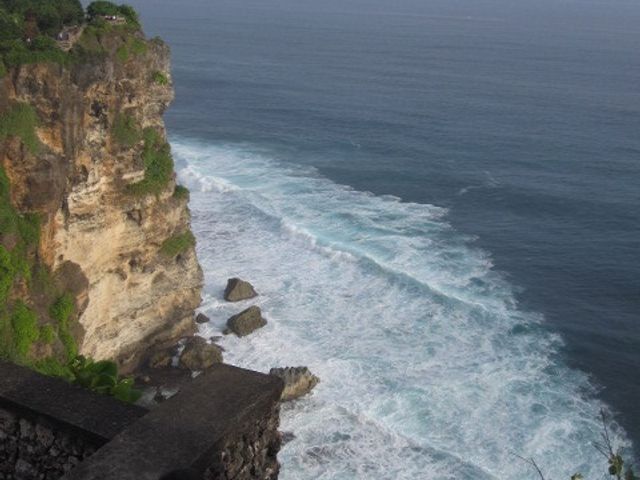 ウルワツ寺院は岬の絶壁の上にあります。中には入れませんが、その絶壁をギリギリの上から見ることができます。波も高く、サーファーもほとんどいないため、とてもきれいな透明度の高い淡いブルーの海水と、真っ白い水しぶきが印象的です。