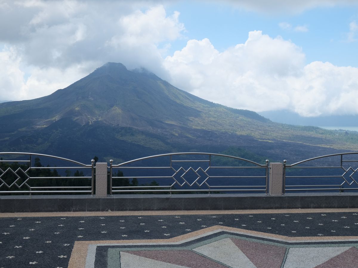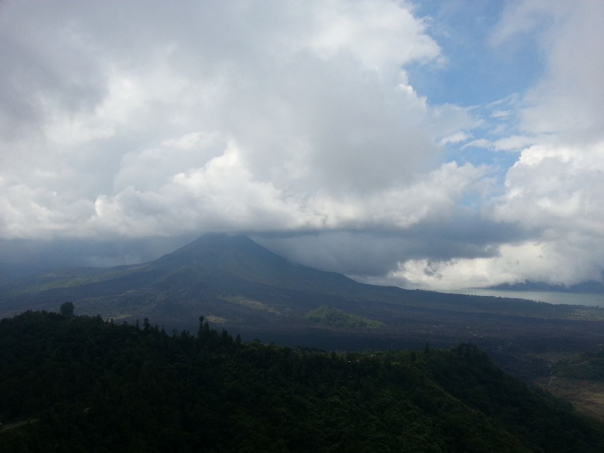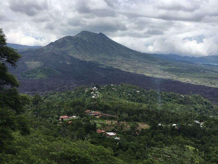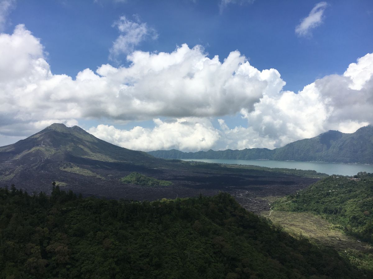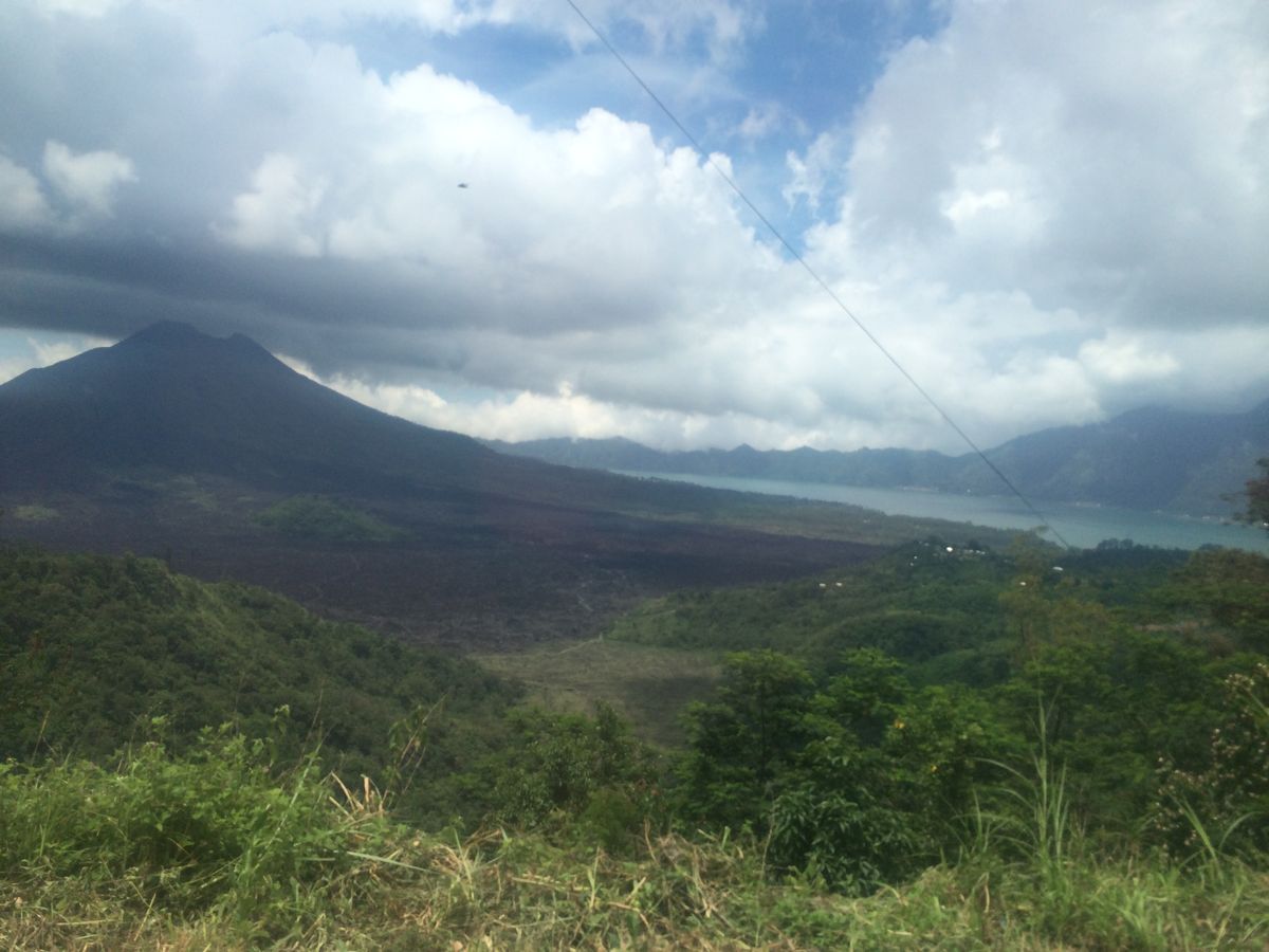ランチはキンタマーニ高原を見渡す高台レストランでいただきました。絶景を見ながらバリの伝統料理を味わうことができました。高原には火山がありました。噴火して何十年も経つのに山裾には今も溶岩の流れた跡が黒く残っていました。曇っていたせいなのか山の上にいたせいなのか少し涼しく感じられました。