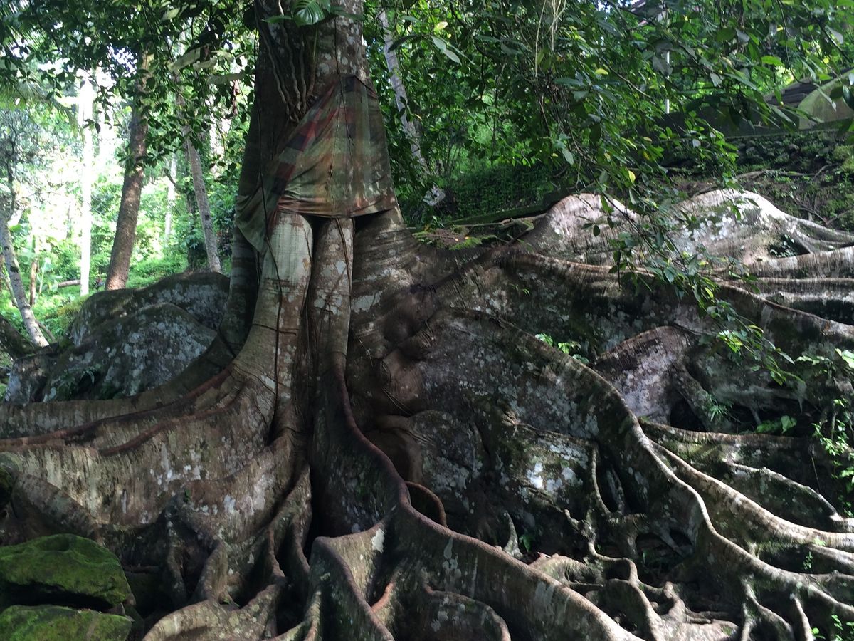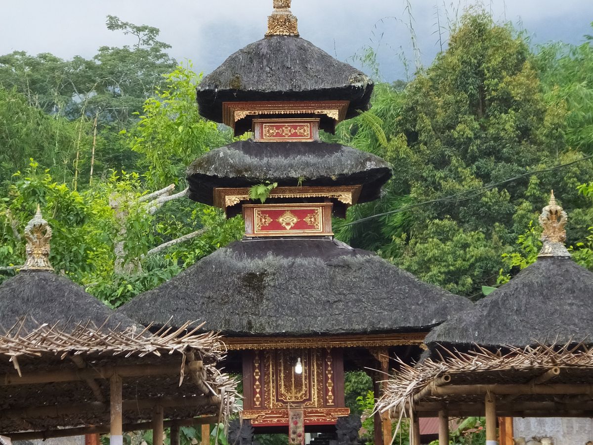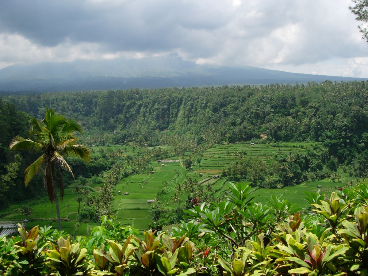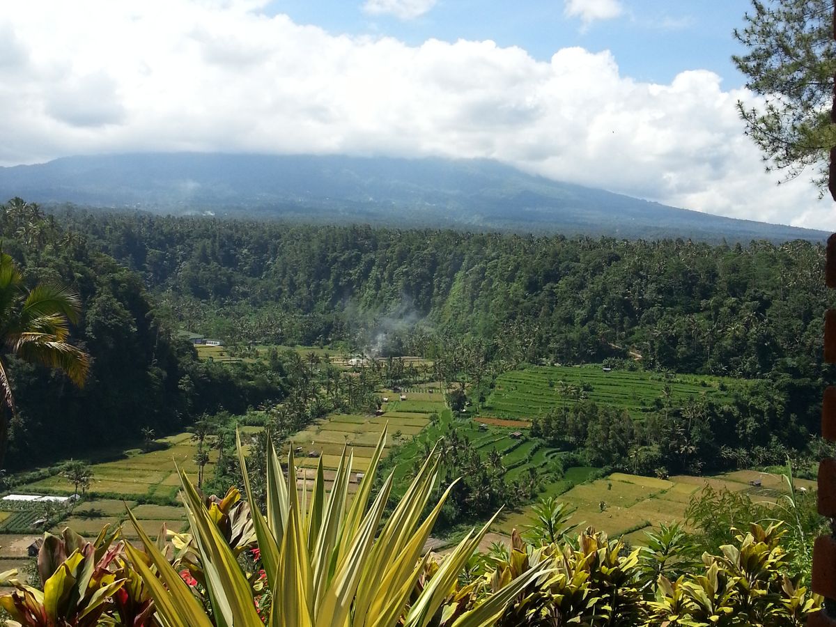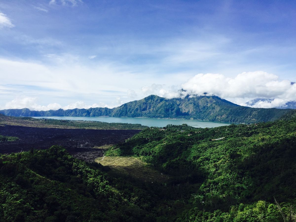 ランチはキンタマーニ高原を見渡す高台レストランでいただきました。絶景を見ながらバリの伝統料理を味わうことができました。高原には火山がありました。噴火して何十年も経つのに山裾には今も溶岩の流れた跡が黒く残っていました。曇っていたせいなのか山の上にいたせいなのか少し涼しく感じられました。