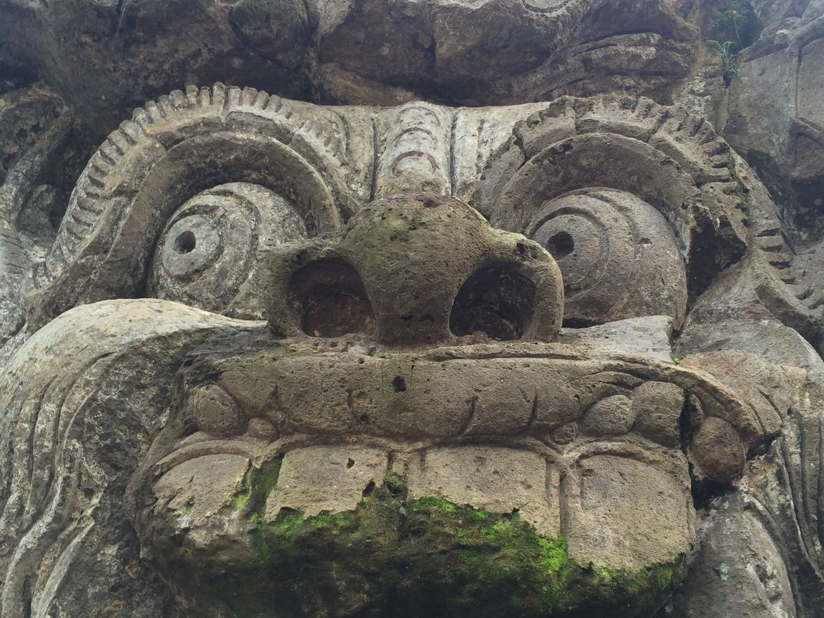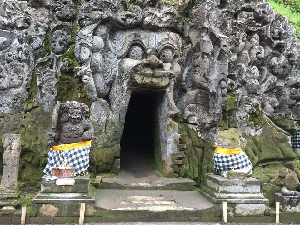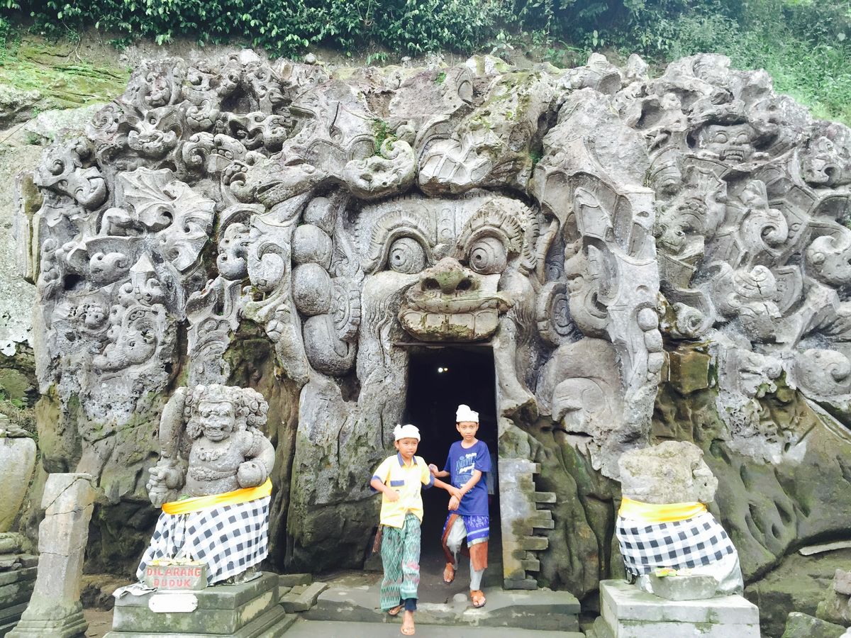最初にゴアガチャ遺跡を見学。ここでは、現地の小学生がたくさん来ていました。魔女ランダの口が入口になっています。 次に、トウガナン村へ。お土産に、織物と木彫りのやもりを購入しました。