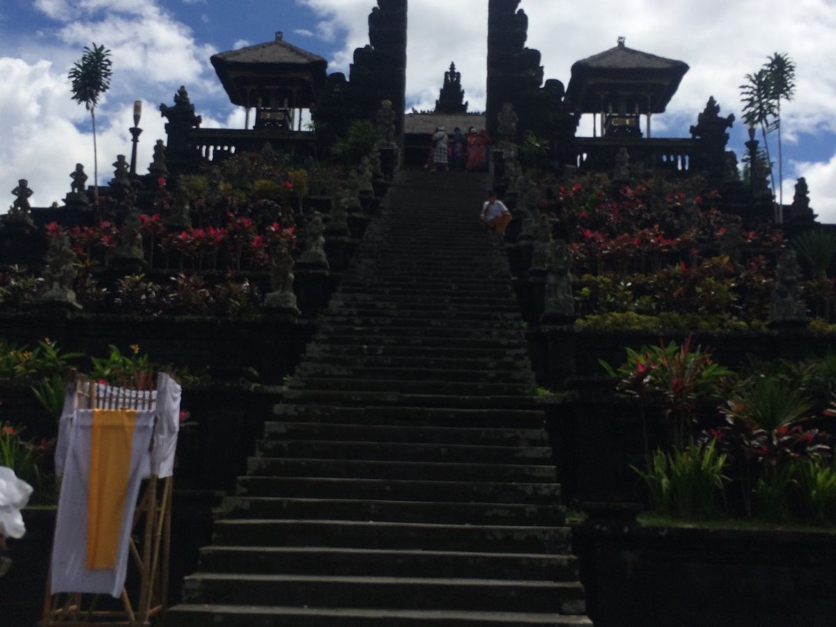 次にブサキ寺院に行きました。車で山を登ります。曲がりくねっていてアップダウンのある山道でした。山の上方まで登り途中に見える景色は綺麗でした。寺院ではサロン着用でした。用意してもらってあったのでそれをつけて観光しました。大きな寺院でした。参拝するところは長い石段を登ったところにありました。私たちはその横の別の石段を登って実際に参拝している方たちの様子を見学させていただきました。