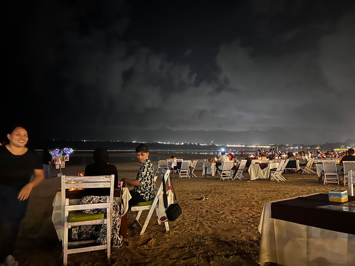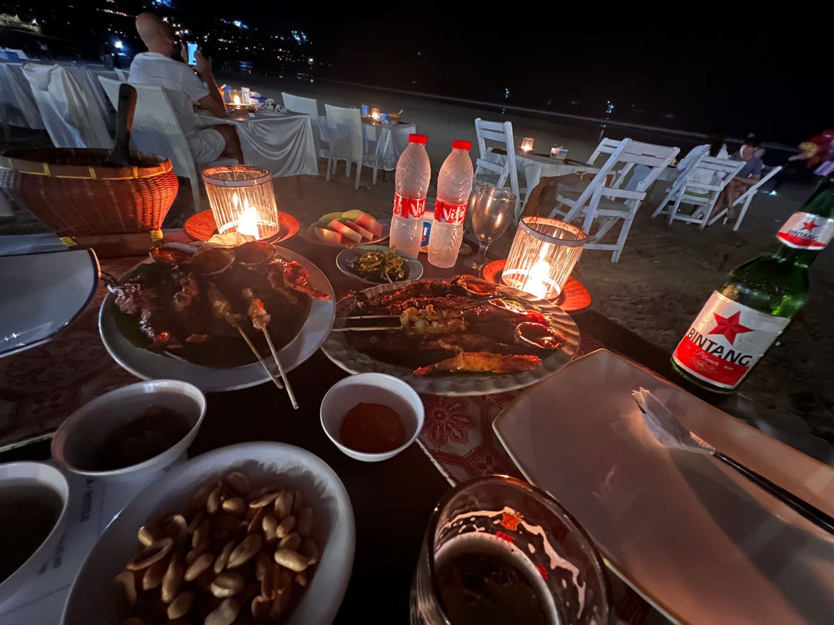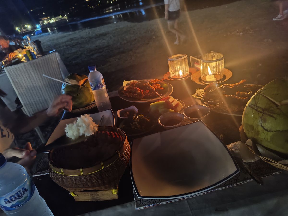 食事は暗闇の中とのことだったので不安でしたが、美味しかったです。でも、確かに暗くて魚の骨が見えないのはちょっと怖かった。それに、途中で潮が満ちてきて、テーブルまで届きそうだったので早めに食事を切り上げました。