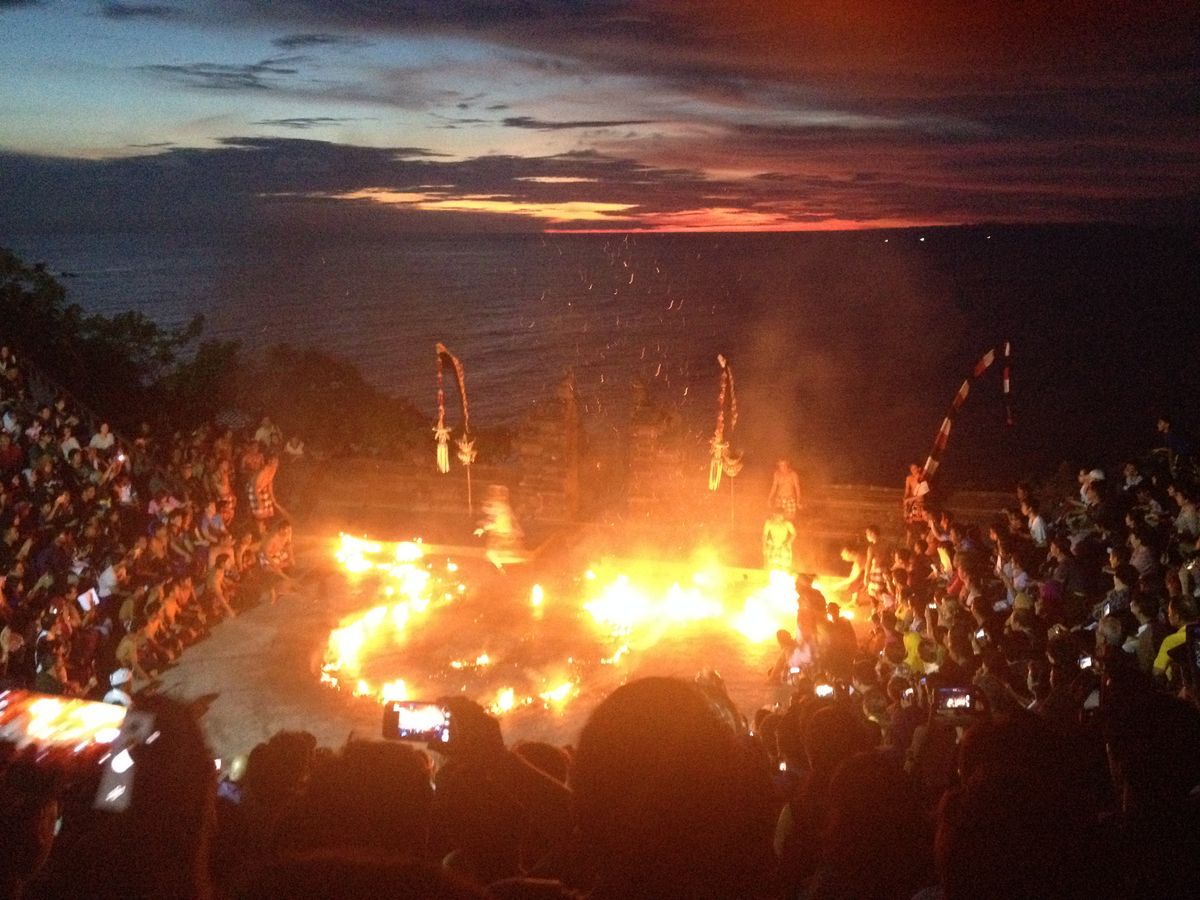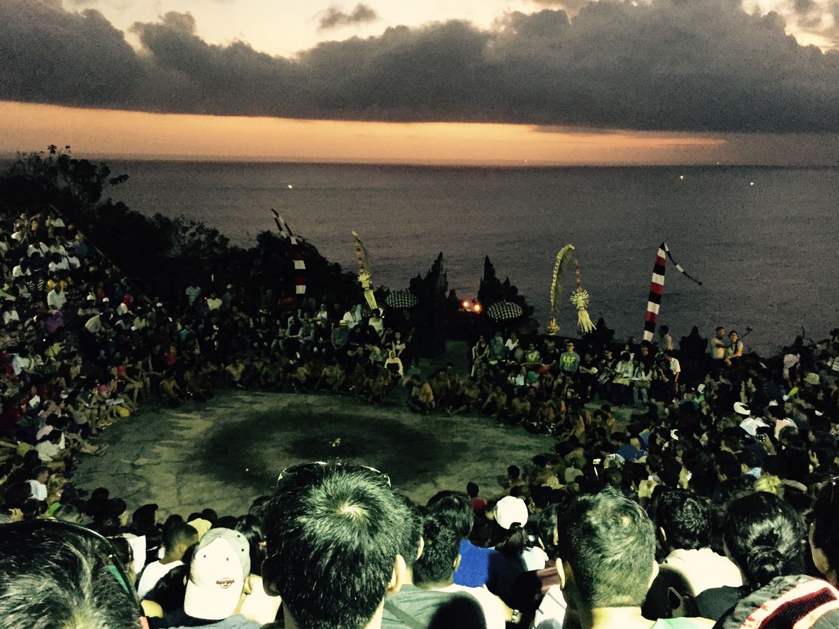 夕方の4時から車に乗って一時間ほどのウルワツ寺院を見に行きました。ガイドさんの話を聞きながらお寺の中を歩き、6時からケチャダンスを見ました。夕日を背にケチャダンス、ファイヤーダンスを堪能し楽しい一時間でした。
