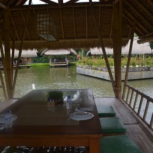 店の入り口を入ってしばらく歩くと池が真ん中にあり、その水上にテーブルが配置されてて