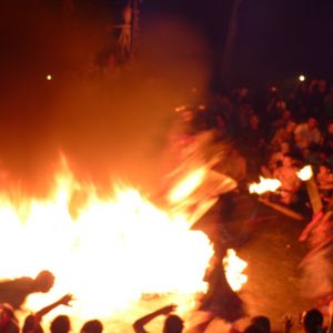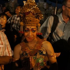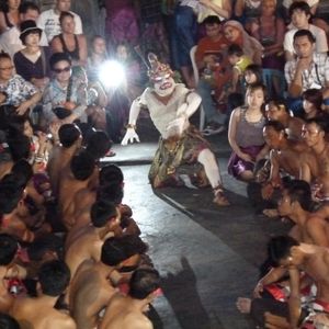 6時前になって、一人のおじさんがやってきて、中央のたいまつにお祈りを捧げて火をつけた。やがて開演。50名ほどの裸の男性がやってきて「ケチャックダンス」を始めた。よく聞いていると、中心でリズムをとる年配の人、ほかに合いの手を入れる人が2人いる。しばらくすると、きれいな衣装のダンサーがケチャックダンサーの中心で踊り始めた。内容は「ラーマーヤナ」である。ヒンドゥー教の最初の国で