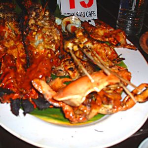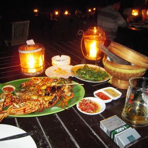 夕暮れ時に食事すると最高のロケーションなレストランですが、暗闇のビーチでも、砂浜のテーブルで素足をさらしてリラックスでき、ザン…ザン…と聴こえてくる波音を聞きながら、よく冷えたグラスに冷えた瓶ビールを注いでグイっと頂きつつ被りつく(笑)、シーフードバーベキューは至福。甘辛サンバルソースのバーベキューソースが美味しかったです。