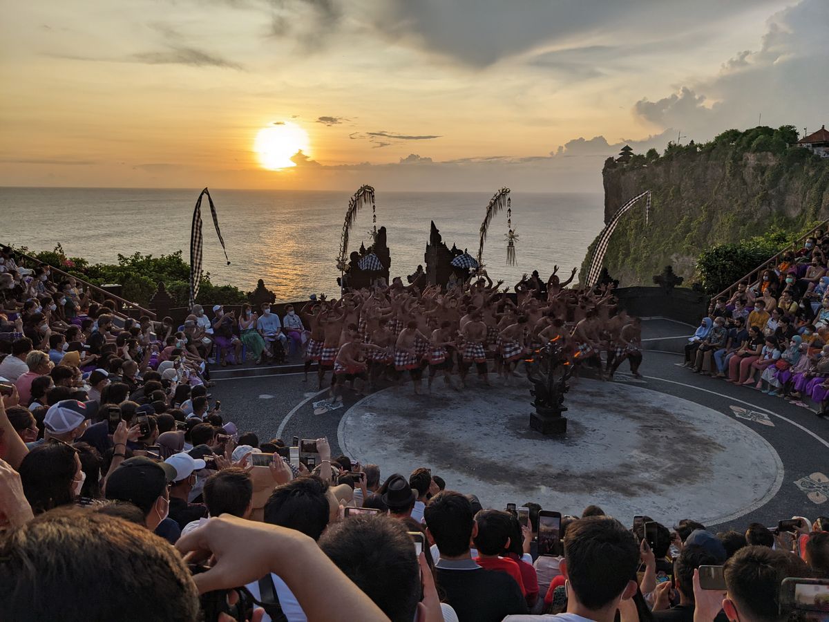 ウルワツ寺院に到着し、夕日を背景にケチャックダンスを観賞しました。観客席は想像と違ってほぼ満席でしたが、多くがインドネシア国内からの観光客の様でした。雨季のためか雲がやや多めながら、雨に降られることなく日が沈むところが辛うじて見ることができました。ダンスの方は、楽器を一切使わず迫力ある肉声の掛け声に乗って何人かのダンサーが踊り回り、すっかり見とれてしまいました。終演後のダンサーとの記念撮影もいい思い出になりました。ガイドさんも気の利く方で良かったです。このオプショナルツアーに参加して本当に良かったと思いました。