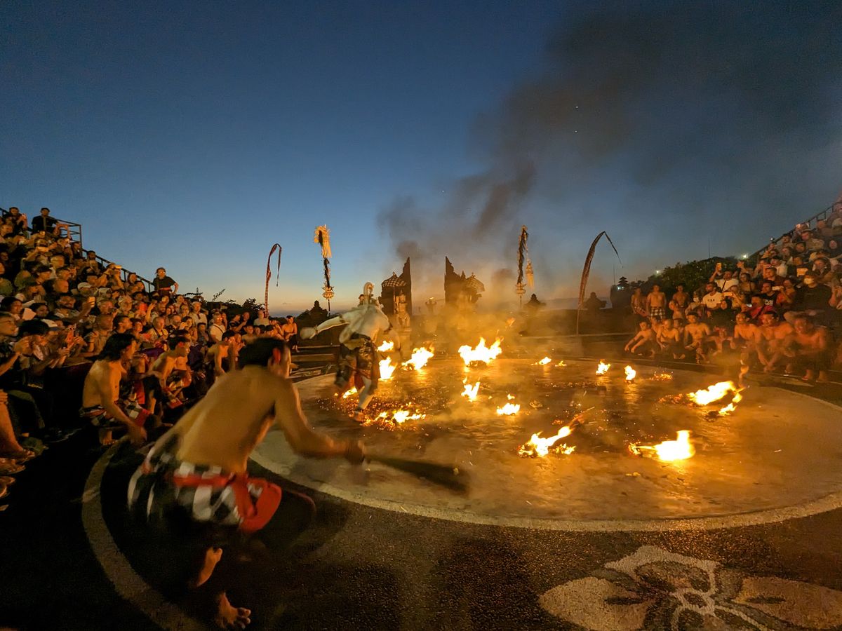 寺院もダンスも観光客が多くてびっくりしました。ダンスはそんなに期待していなかったのですが、迫力もあり、笑いもありで、見てよかったです。ディナーはジンバランのシーフードバーベキューが有名とのことでそれを選択したのですが、とにかく寺院からジンバランまでの渋滞がひどく、1時間半もかかり、またお店の人の対応もあまりよくなく、真っ暗な砂浜で何を食べているのかもわからず、すこし期待外れでした。ツアーで食事内容が決まっていたからほおっておかれたのかもしれません。個人的にもう少し明るい時に行ってみたらまた違うと思います。