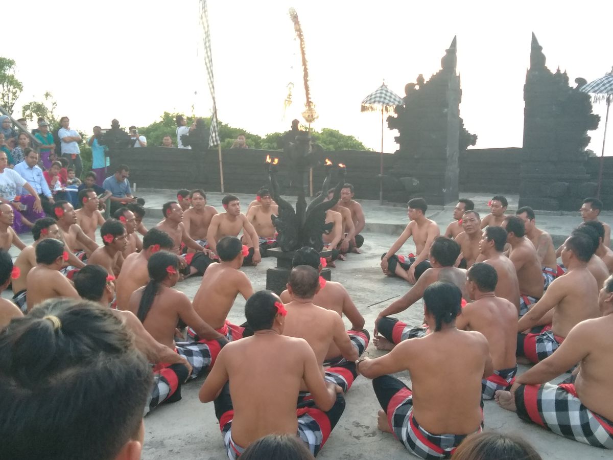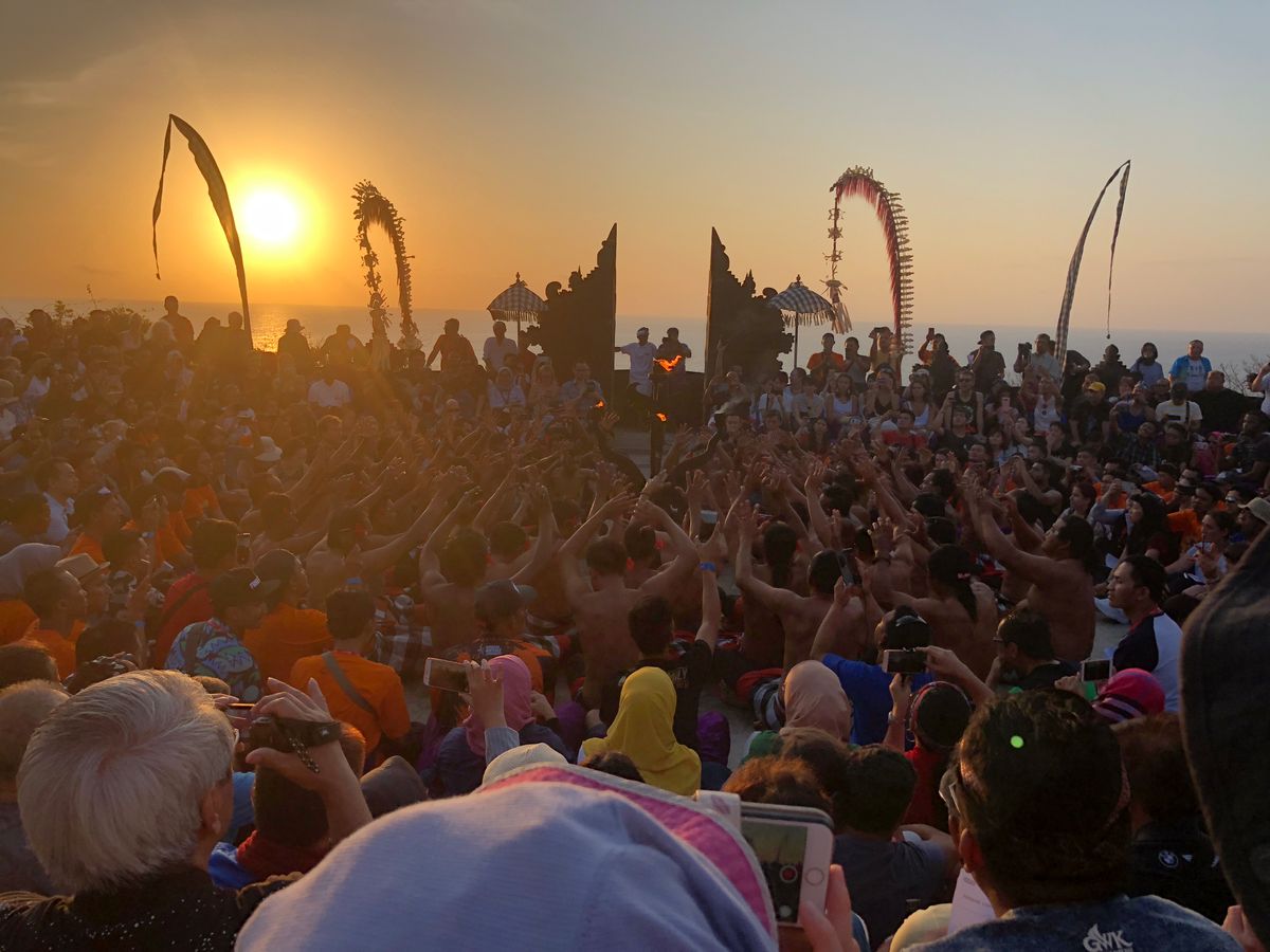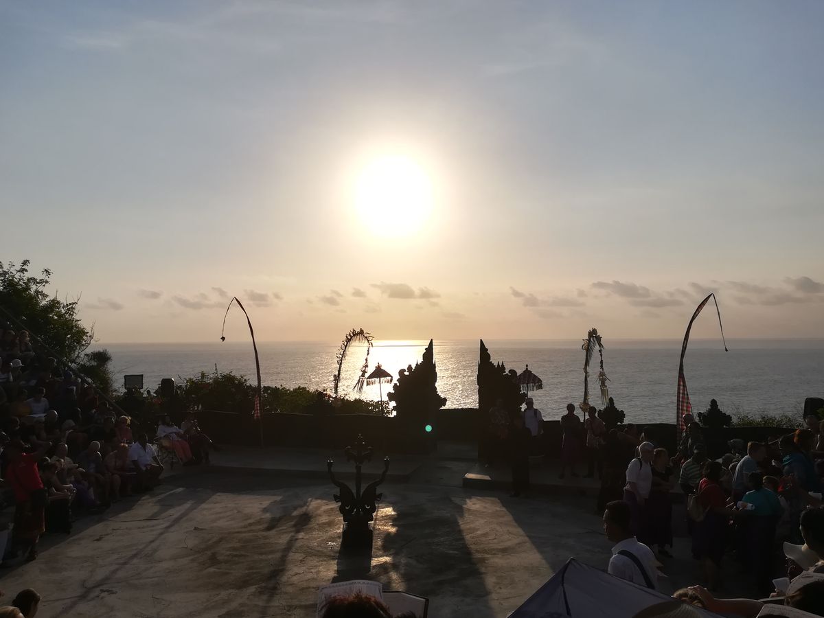 バリ島のツアーガイドさんは時間に正確なのか時間に余裕があるのかわからないが、ピックアップ時間の1時間前にはホテルに到着していました。ウルワツ寺院はあまり見るところがなく、周りの景観が良かったです。当日混雑していてケチャックダンスの鑑賞時間の1時間半位から座って待っていました。西日がきつく、サングラスか日傘をもっていったほうがいいです。この国は人数制限はあまり考えていないようで、踊り子のすぐ後まで観客を入れていました。開演した当初はあまりおもしろくはなかったですが、途中から白猿が出てきて会場を無尽に動き回り、大変迫力がありました。