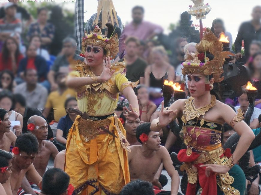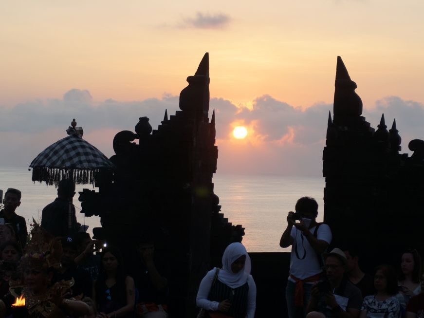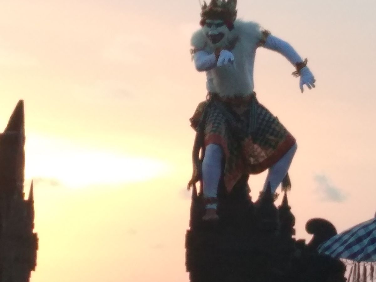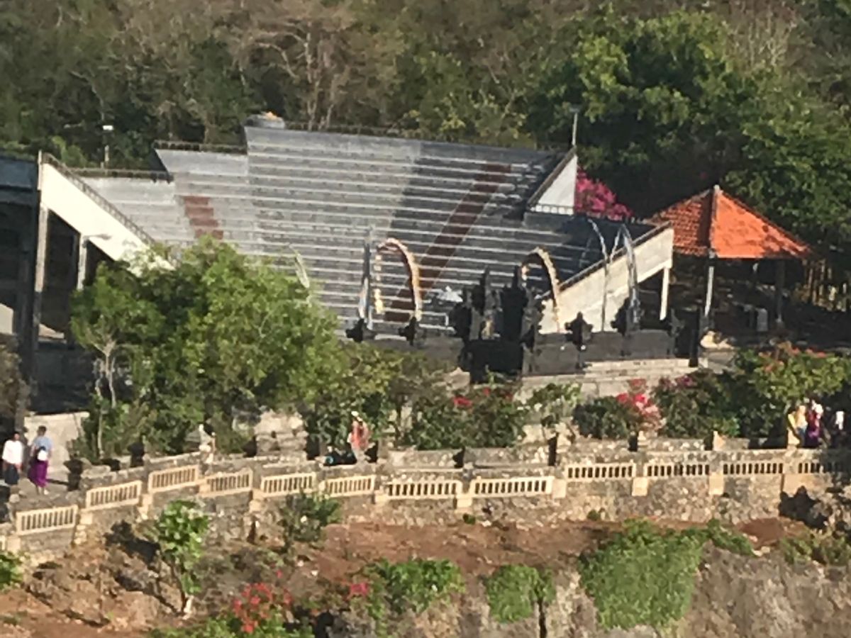 バリ島のツアーガイドさんは時間に正確なのか時間に余裕があるのかわからないが、ピックアップ時間の1時間前にはホテルに到着していました。ウルワツ寺院はあまり見るところがなく、周りの景観が良かったです。当日混雑していてケチャックダンスの鑑賞時間の1時間半位から座って待っていました。西日がきつく、サングラスか日傘をもっていったほうがいいです。この国は人数制限はあまり考えていないようで、踊り子のすぐ後まで観客を入れていました。開演した当初はあまりおもしろくはなかったですが、途中から白猿が出てきて会場を無尽に動き回り、大変迫力がありました。