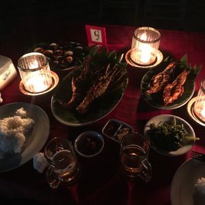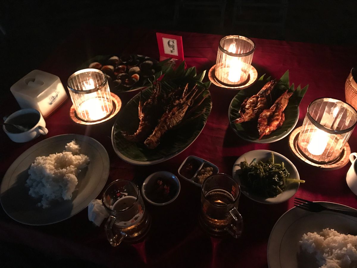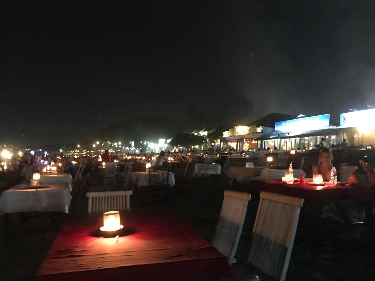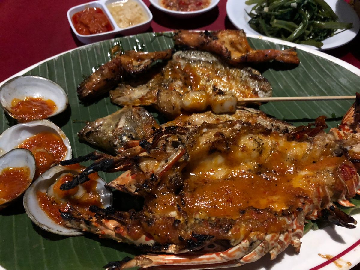 ダンス鑑賞後は寺院を出て、ジンバランのシーフード屋台に連れて行ってもらいました。値段は高いですが、砂浜に設置された席で、焼きたてのシーフードをたべれて、とてもいい思い出になりました!カードも使えるので、現金じゃなくて良いのが助かりました。浜辺ではその場で歌を歌ってくれる人もいて、チップを払えば目の前でリクエスト(English,happy songとかでok!)した曲を歌って、写真も一緒に撮ってくれます。チップはまとめて払いだから、2〜3曲お願いしてもよかったなーと思いました。