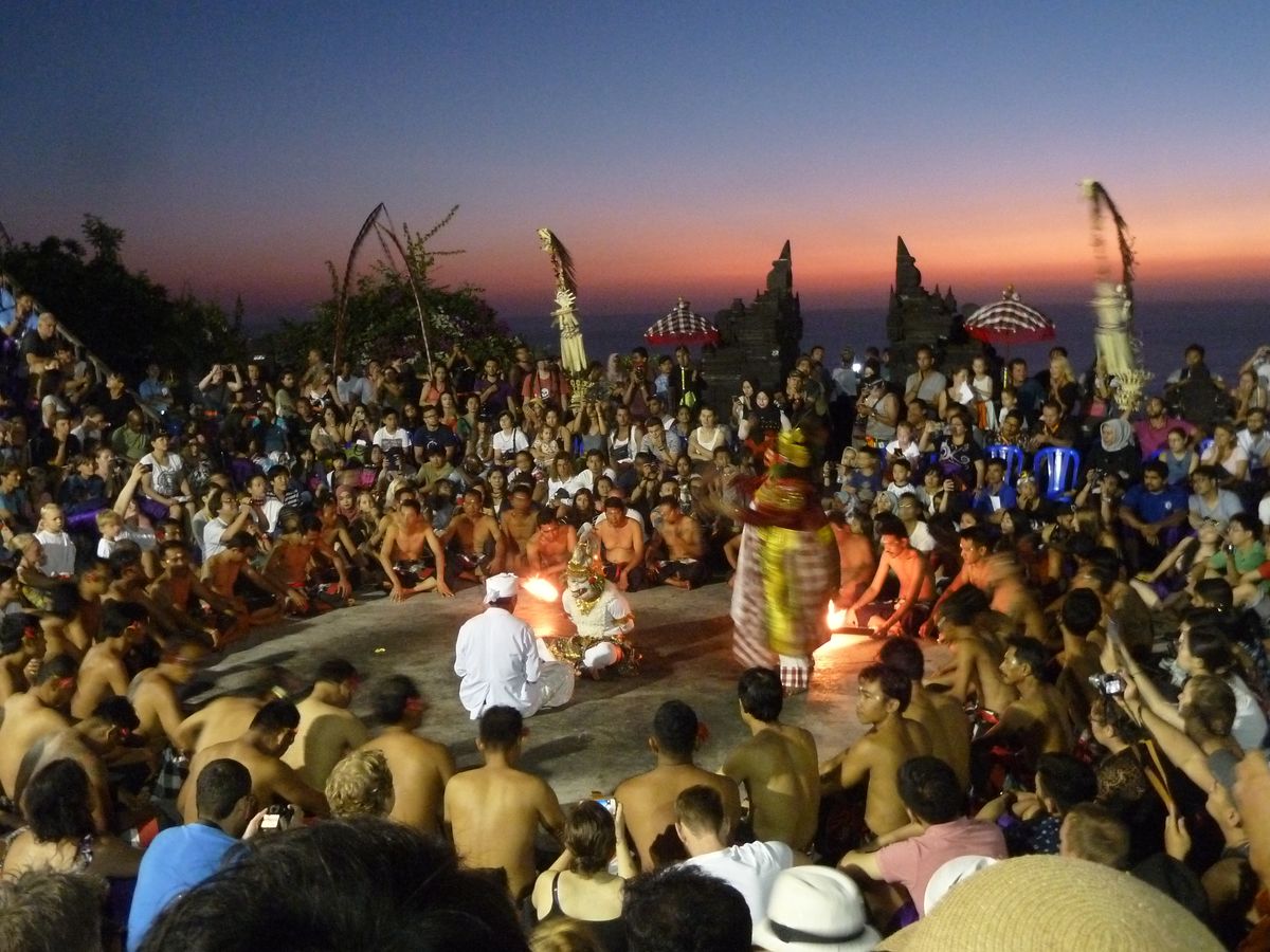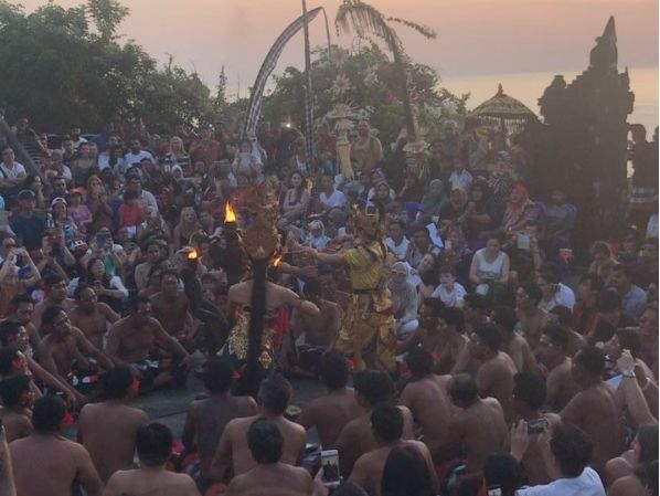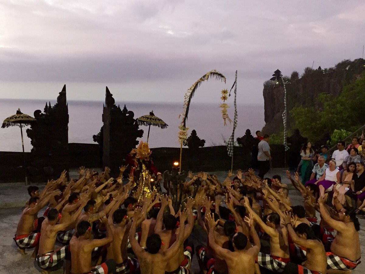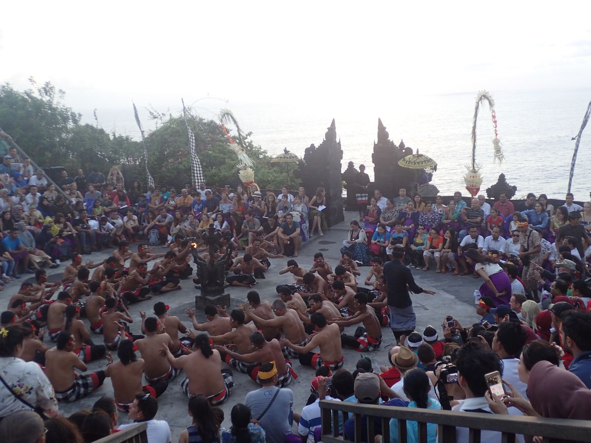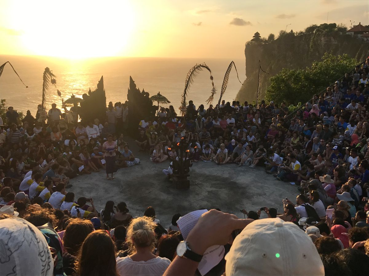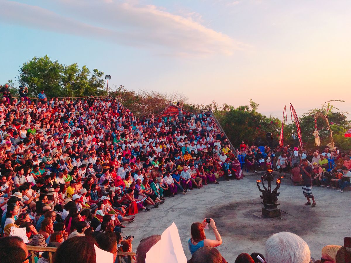 ウルワツ寺院までの断崖絶壁に沿った遊歩道を1時間ほど散策し、17:00には会場入り。ガイドさんのおかげで出口近くの三列目に座れました。結果、これが正解でした。その後、どんどん観光客が入ってきて、シートに座れない人は舞台をぐるっと囲んで座る始末。