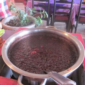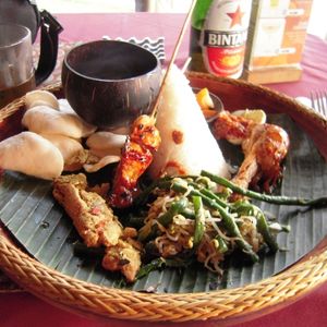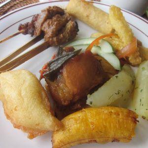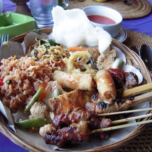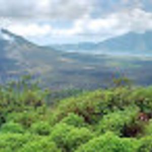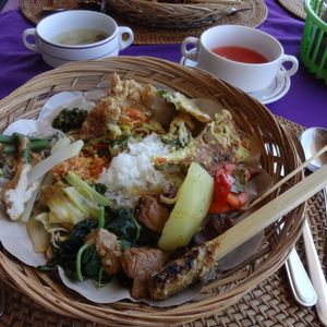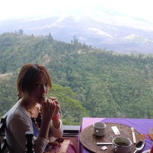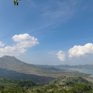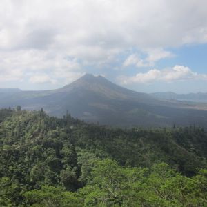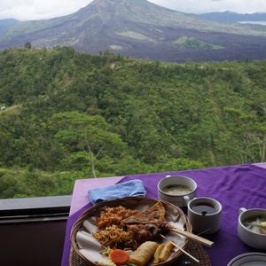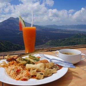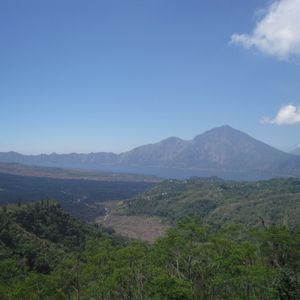12時40分、「キンタマーニ高原」到着。3つの火口を持つ海抜1717mの「バトゥルー山」と「バトゥルー瑚」「アバン山」の眺めがすばらしい。昼食はインドネシア料理のバイキングである。最初はすいていたが、次第に混み合ってきた。料理は種類がたいへん多く、おいしかった。料金は、料理がRp.100,000、ビールがRp.70,000であった。1時30分、出発。
