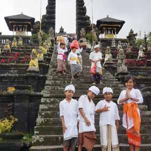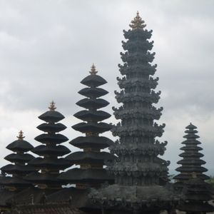 11時、8Cに建立された、バリ最古のヒンドゥー教寺院「ブサキ」に到着。背後に海抜3142mの活火山「アグン山」が見えた。ここは、「バリヒンドゥー教」の総本山ともいうべき寺院で、山の斜面に沿って多くの寺院が建てられている。