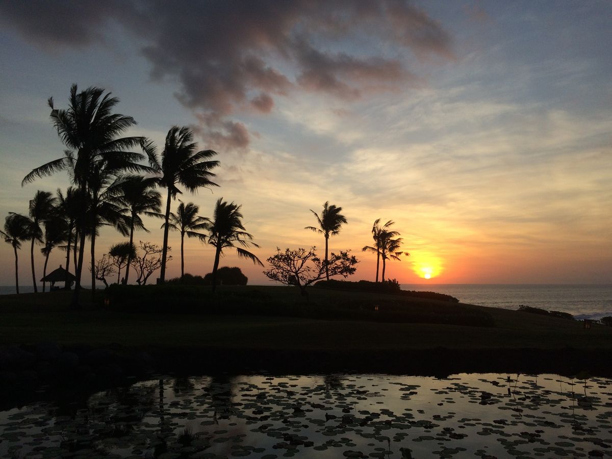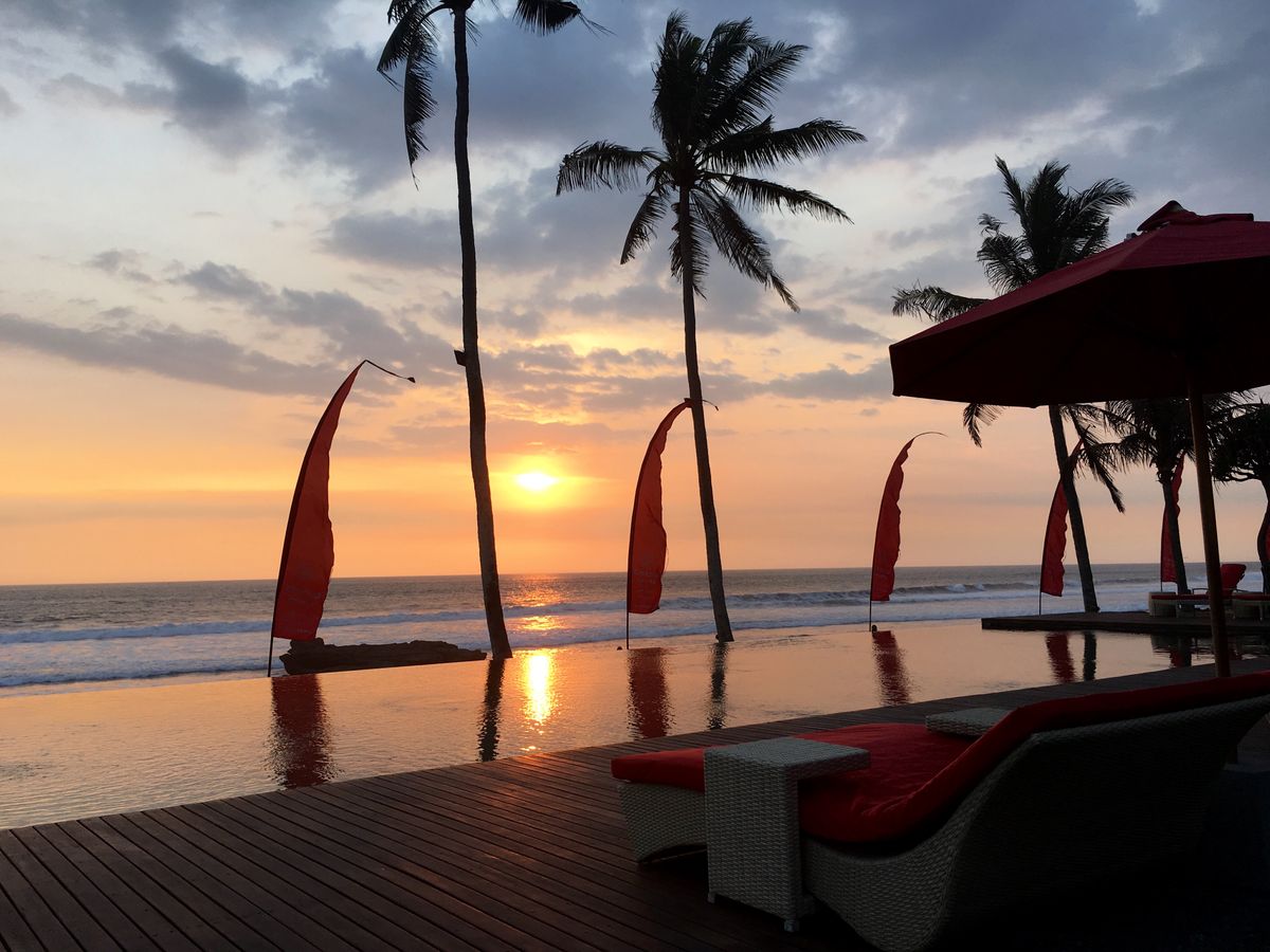 次にタナロット寺院に行きました。観光客がとても多く、夕日が沈む様子を見るためにたくさんの人が芝生の上に座っていました。インド洋の海の崖の上に建てられた寺院は満潮のため遠くからでしたが綺麗でした。最後に夕食を食べに少し離れた海の前に建てられたヴィラのレストランに行きました。サンセットを見ながらインドネシア料理のフルコースをお腹いっぱい食べました。目の前はインド洋の地平線と空しか見えない景色の夕日はとてめ綺麗で感動で涙が出るほどでした。今度は泊まりに来たいと思うほどとても綺麗なヴィラでした。貸切状態のレストランで心ゆくままに絶景を見ながら料理を堪能する事ができ、とても思い出に残る日になりました。